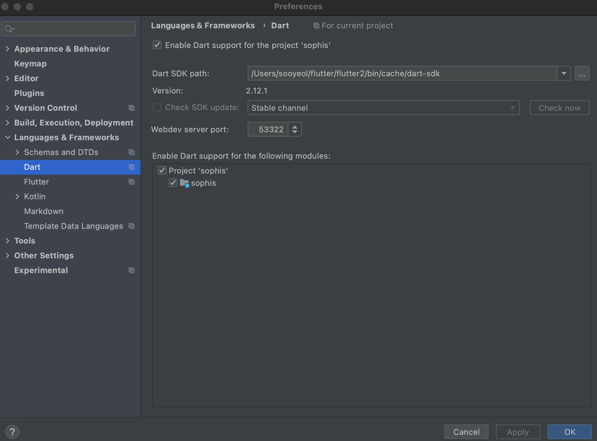 그다음 안드로이드 스튜디오를 들어가 다트 sdk 경로를 변경해주자.